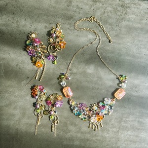 ガラス、メタルパーツ、樹脂、クレイ、その他沢山の素材を組み合わせ、一つ一つ手作業で作っています。樹脂及びクレイの色味は一つずつ調色しております。若干の個体差がありますことをご了承下さい。