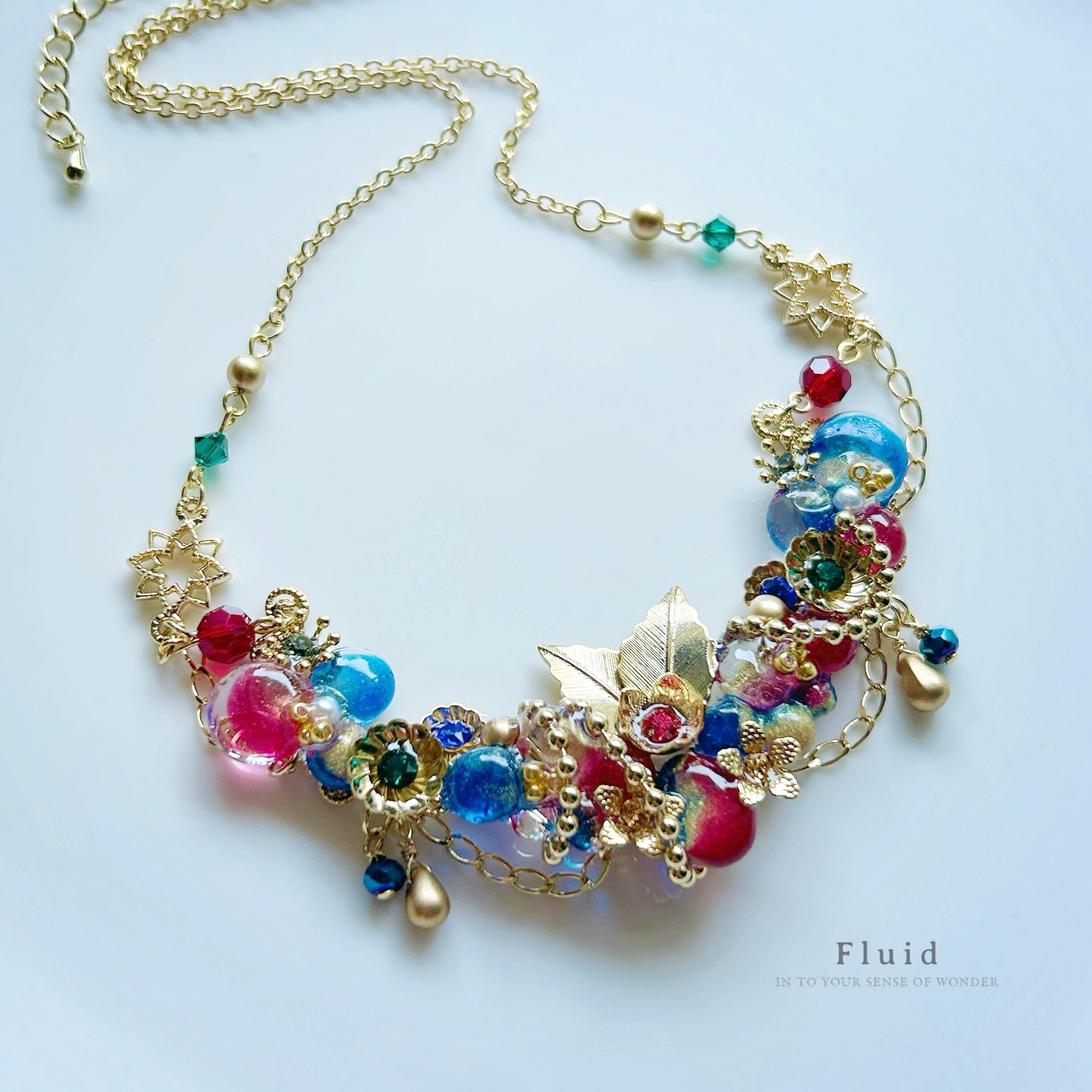 ガラス、メタルパーツ、樹脂、クレイ、その他沢山の素材を組み合わせ、一つ一つ手作業で作っています。樹脂及びクレイの色味は一つずつ調色しております。若干の個体差がありますことをご了承下さい。