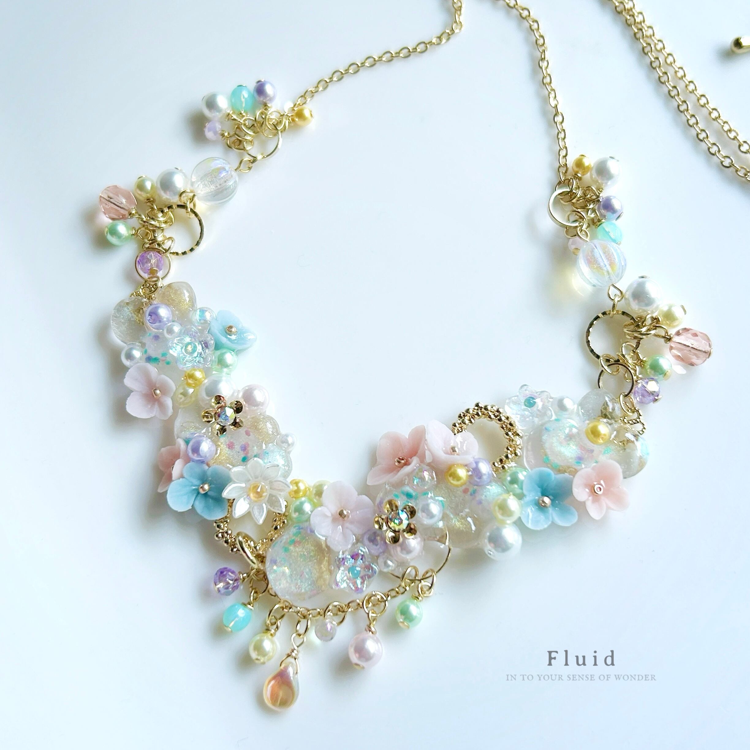 ふわりとほどけるような繊細さ、おとぎ話にふさわしい愛らしさを、砂糖菓子に似せたクレイフラワーと淡い色のパーツを合わせることで表現しています。