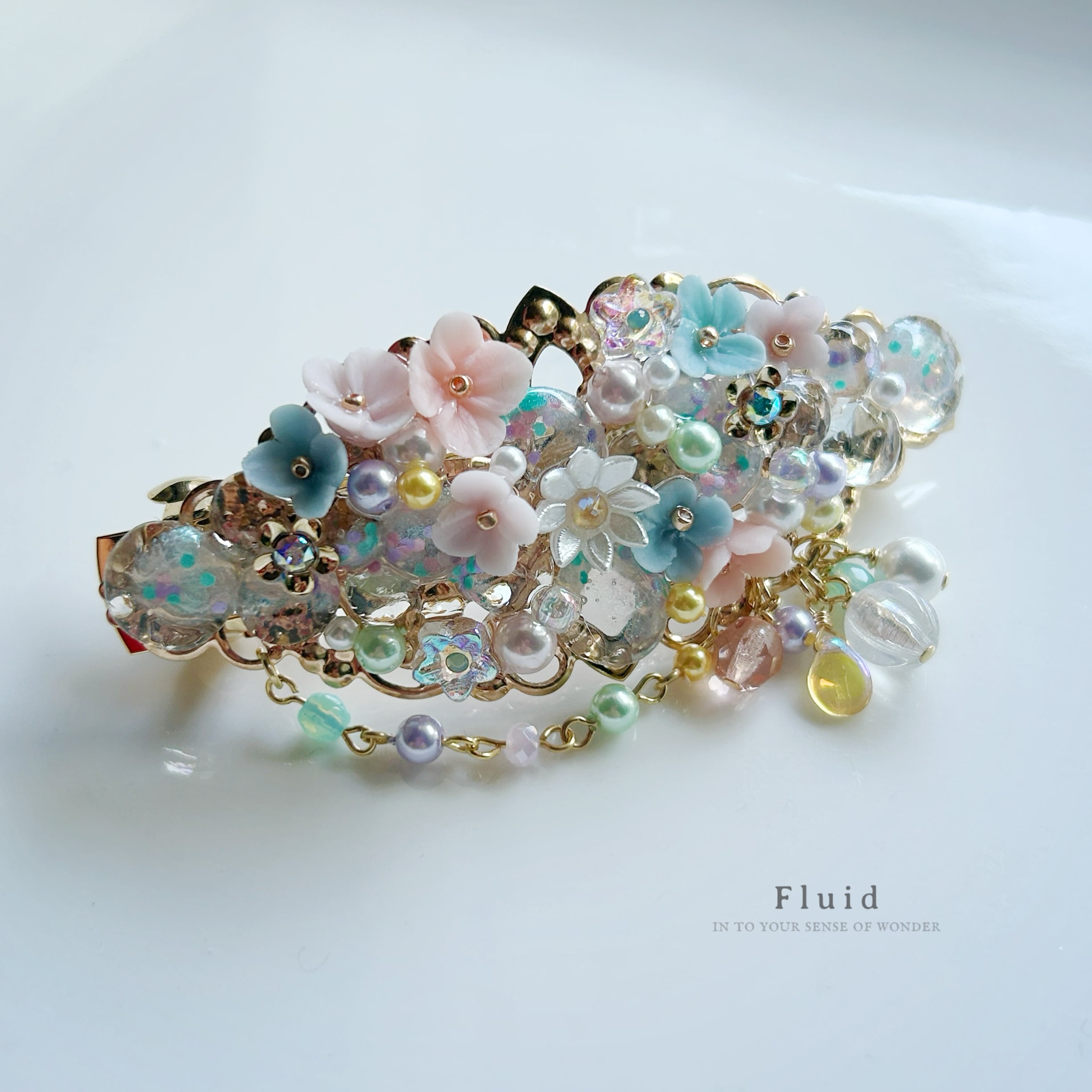 ふわりとほどけるような繊細さ、おとぎ話にふさわしい愛らしさを、砂糖菓子に似せたクレイフラワーと淡い色のパーツを合わせることで表現しています。