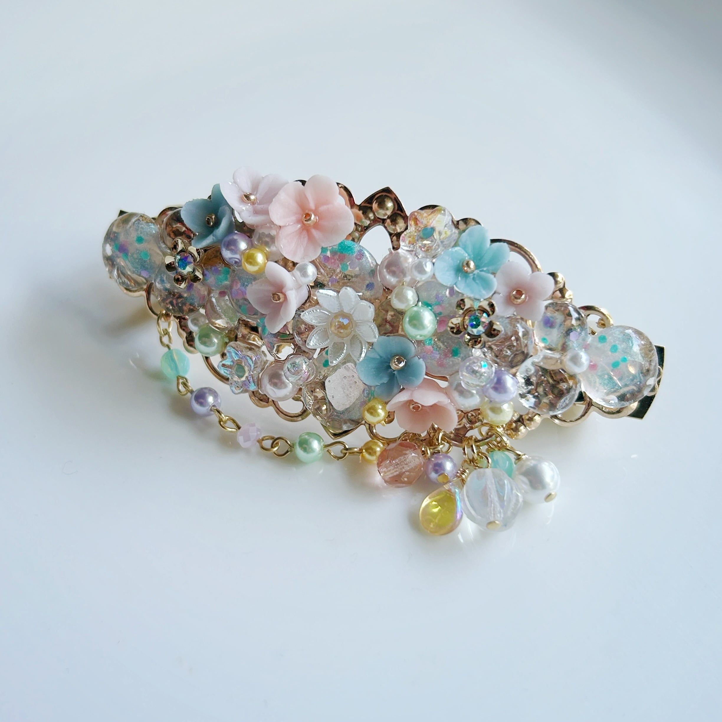 ガラス、スワロフスキークリスタル、樹脂、合金パーツ、合金バレッタ金具